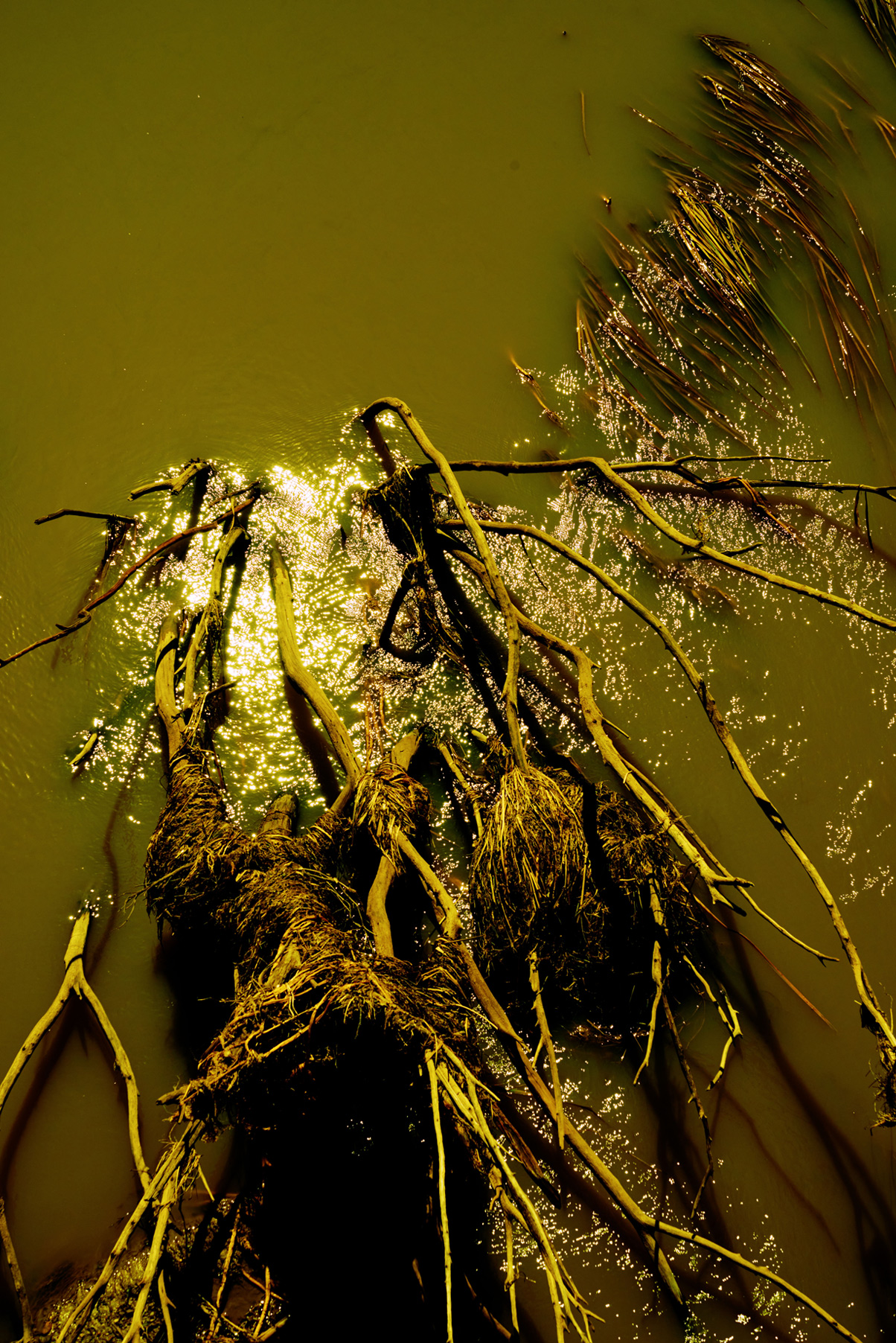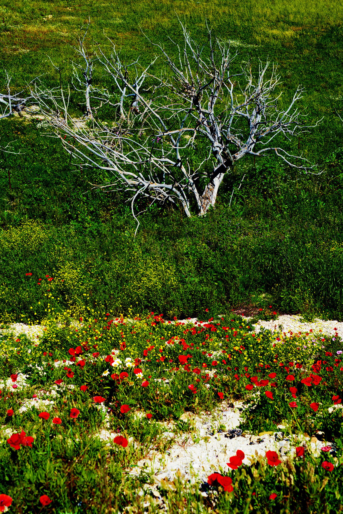 We took photographs at the GUADALCACIN reservoir, the second largest in Andalusia, which was almost a hundred metres deep in some places thirty years ago. Today the water level has dropped to a minimum. Trees, villages, roads and bridges which were lost to the waves decades ago have risen from the depths of the lake like memorials. Every year in the spring, slight rainfall enables the flora to appear as florid green and colourful blooms on the bed of the former lake. By the end of May it is all over and the landscapes become arid in the blazing sunlight of southern Spain. The dominant colour is then brown and the water level continues to sink.