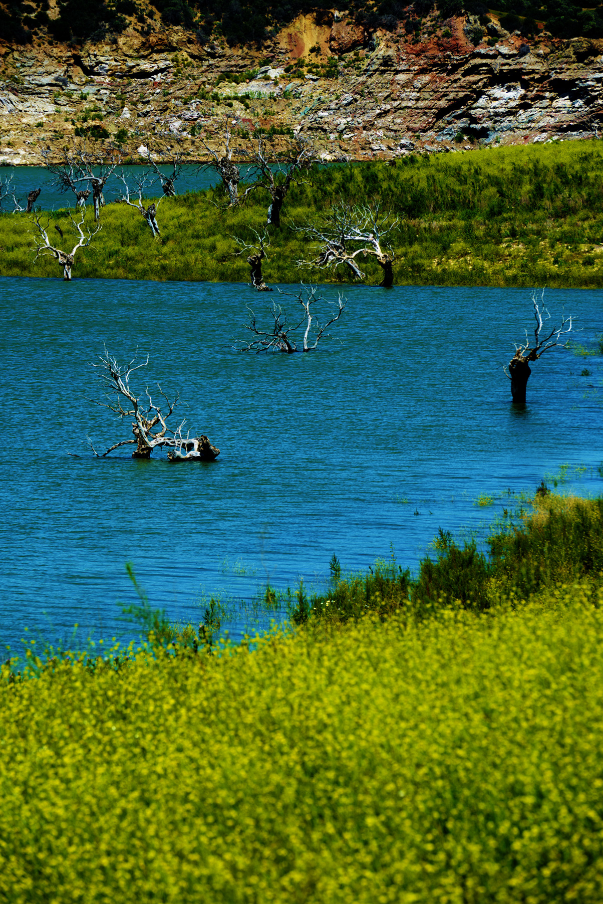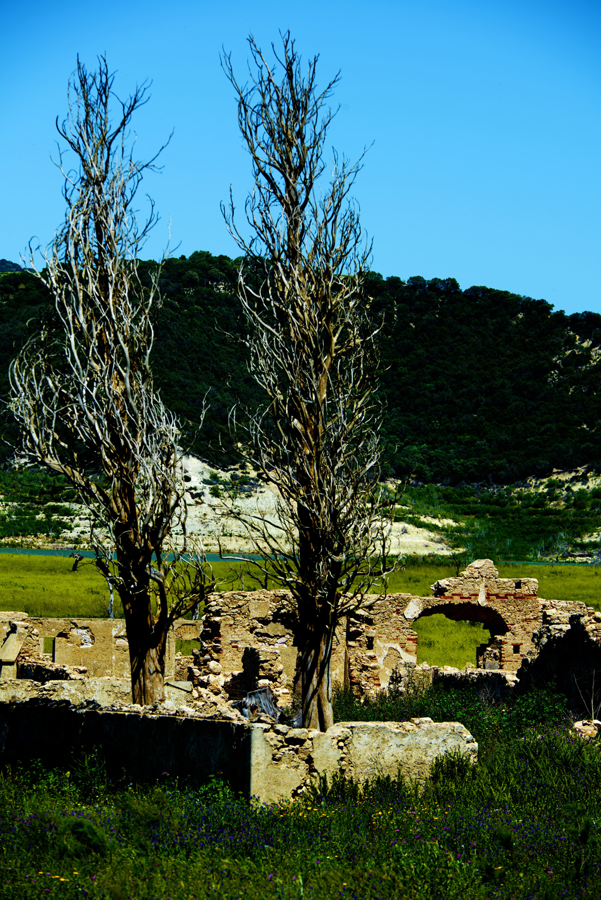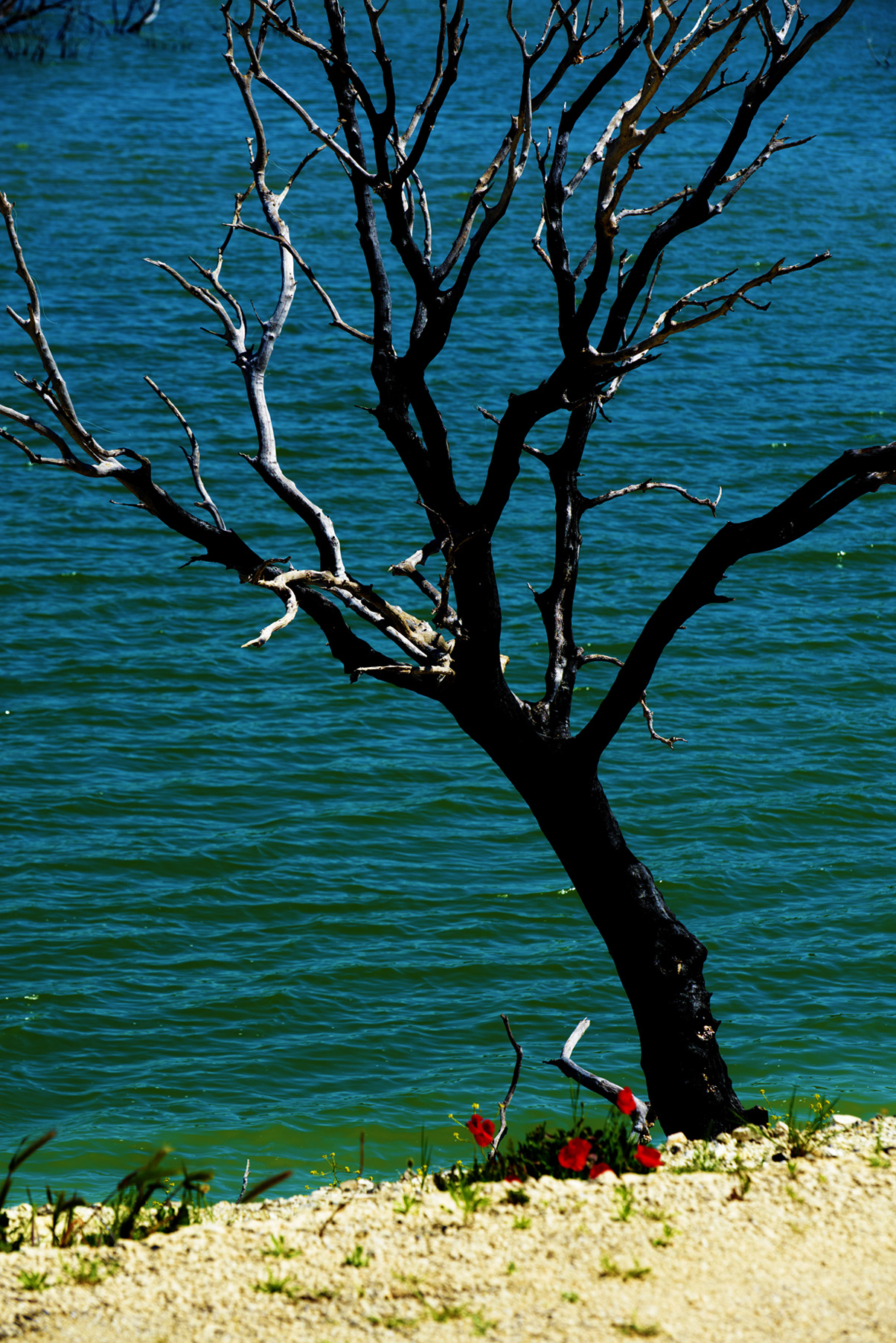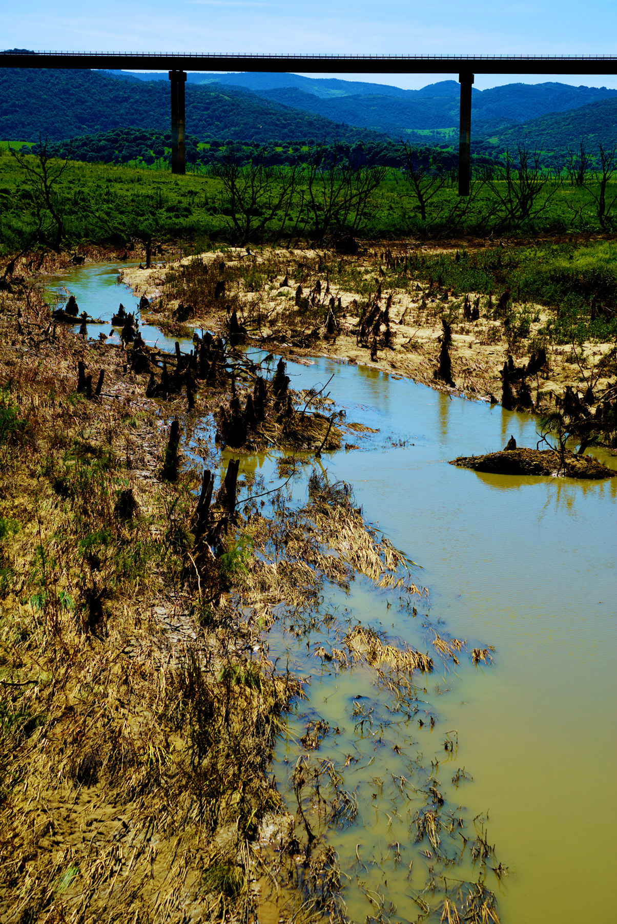 Wir fotografierten am GUADALCACIN, dem zweitgrößten Stausee Andalusiens, der vor dreißig Jahren an manchen Stellen an die hundert Meter tief war. Heute ist sein Wasserstand auf ein Minimum gefallen. Bäume, Dörfer, Straßen und Brücken die vor Jahrzehnten in den Fluten versanken, sind wie Mahnmale aus den Tiefen des Sees auferstanden. Jedes Frühjahr ermöglicht geringer Niederschlag der Pflanzenwelt sich auf dem ehemaligen Seegrund in grün und bunter Blütenpracht zu zeigen.