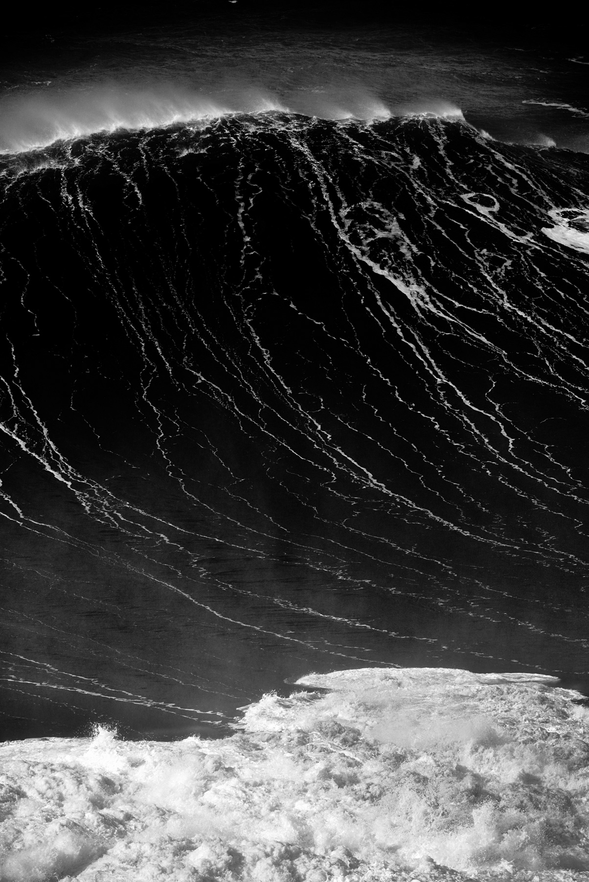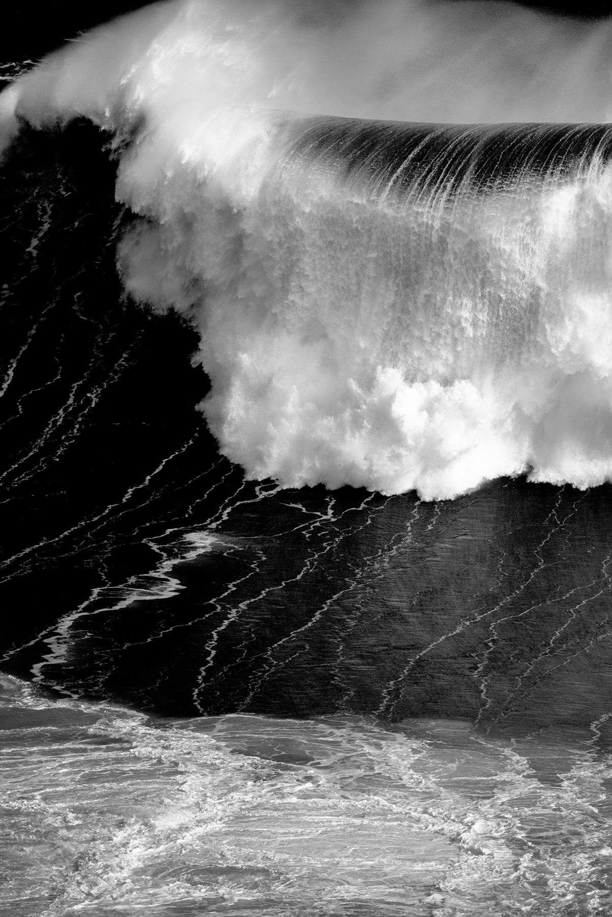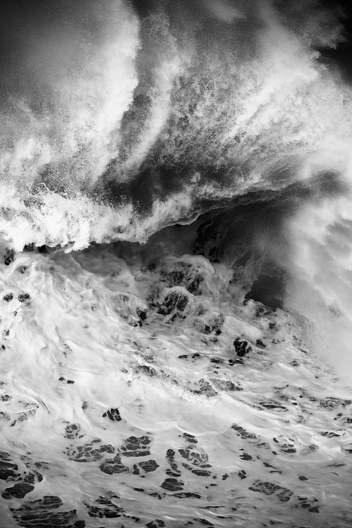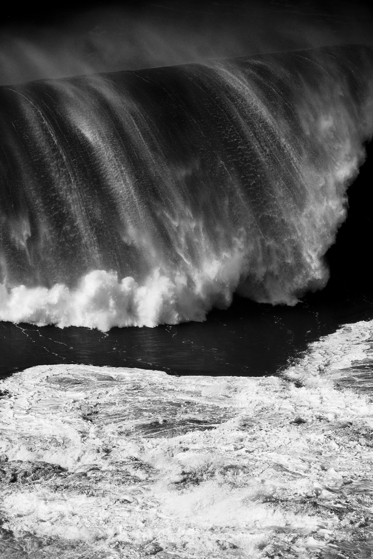 The photographs were taken at the beginning of 2016 on the west coast of Portugal. There, during the winter and spring storms, waves are thrown up that can be roughly 30 meters high if the tides, phase of the moon and direction of the wind are propitious. An additional factor is the 5000 meter-deep canyon in the Atlantic Ocean that stretches to the Portuguese coastline, where swells and formations enormously amplify the waves so that they can pile up as high as a ten-story house.
