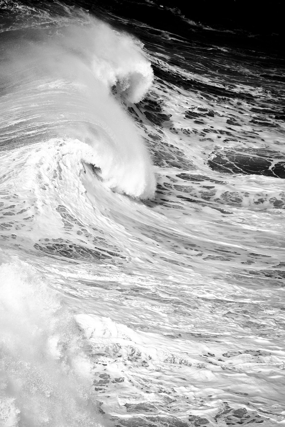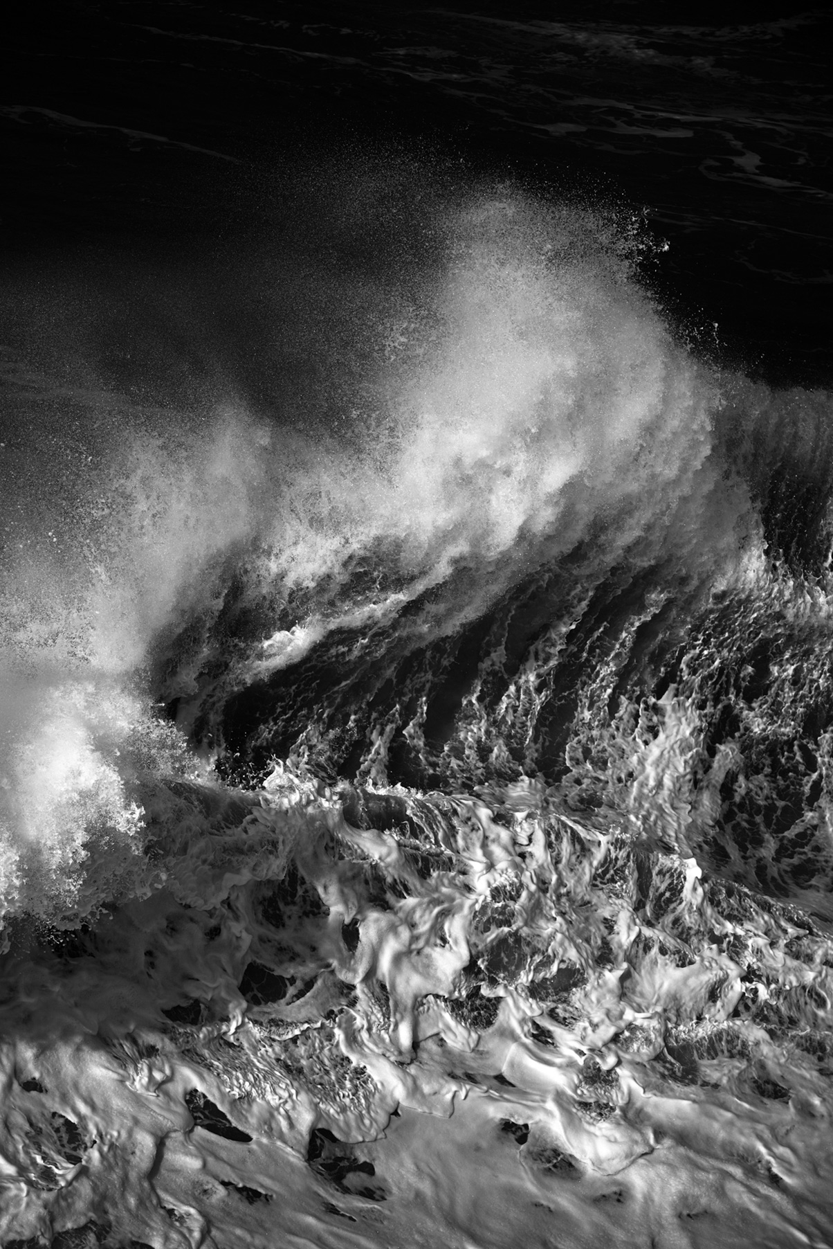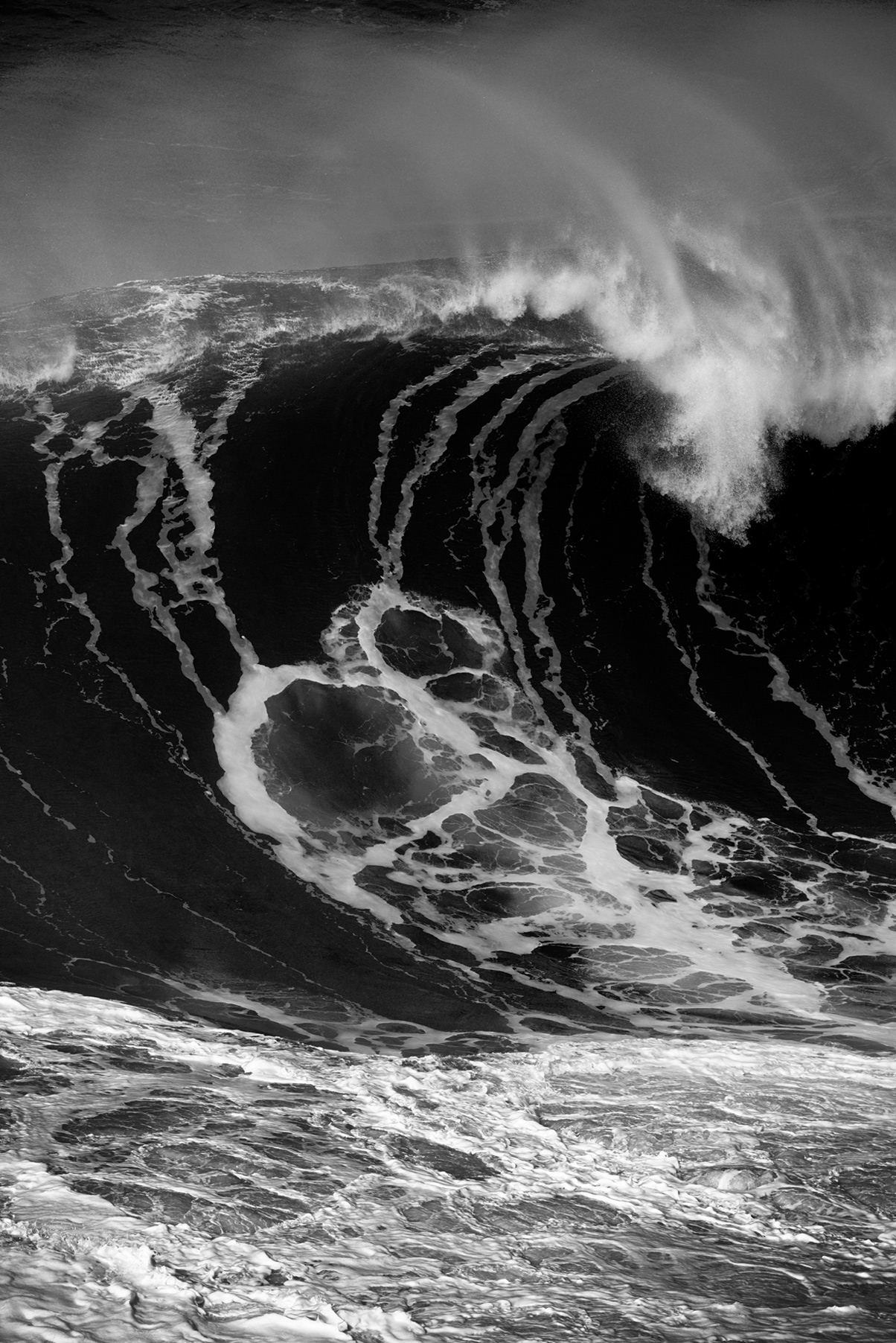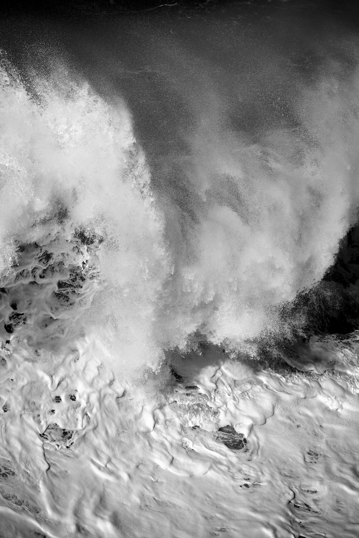 The photographs were taken at the beginning of 2016 on the west coast of Portugal. There, during the winter and spring storms, waves are thrown up that can be roughly 30 meters high if the tides, phase of the moon and direction of the wind are propitious. An additional factor is the 5000 meter-deep canyon in the Atlantic Ocean that stretches to the Portuguese coastline, where swells and formations enormously amplify the waves so that they can pile up as high as a ten-story house.