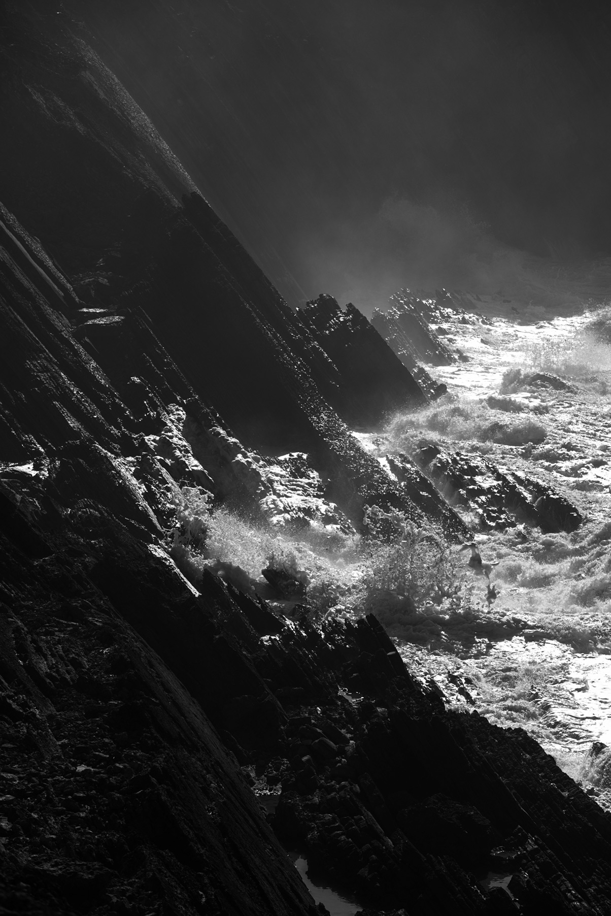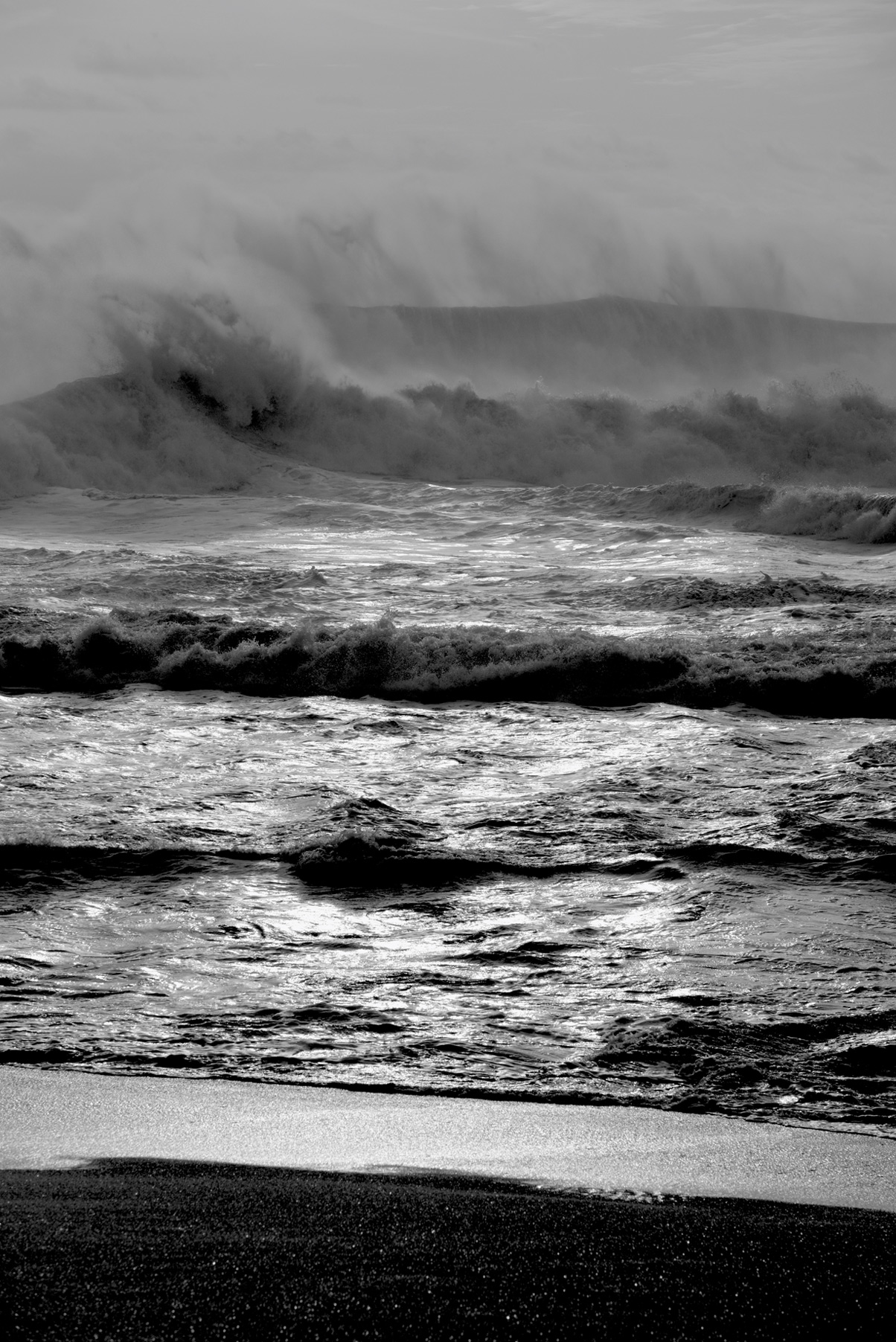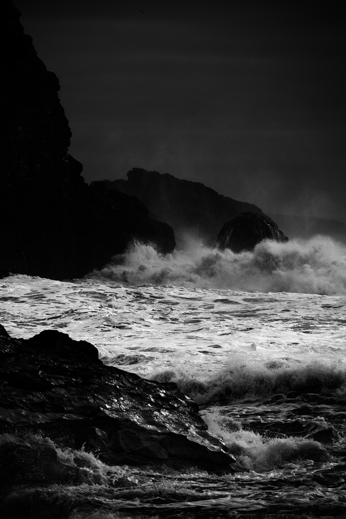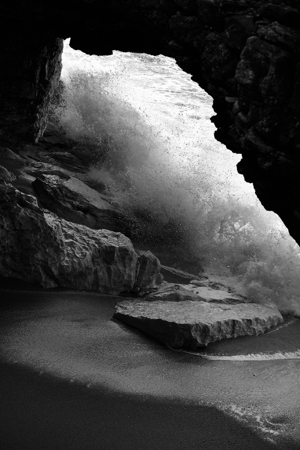 The photographs were taken at the beginning of 2016 on the west coast of Portugal. There, during the winter and spring storms, waves are thrown up that can be roughly 30 meters high if the tides, phase of the moon and direction of the wind are propitious. An additional factor is the 5000 meter-deep canyon in the Atlantic Ocean that stretches to the Portuguese coastline, where swells and formations enormously amplify the waves so that they can pile up as high as a ten-story house.